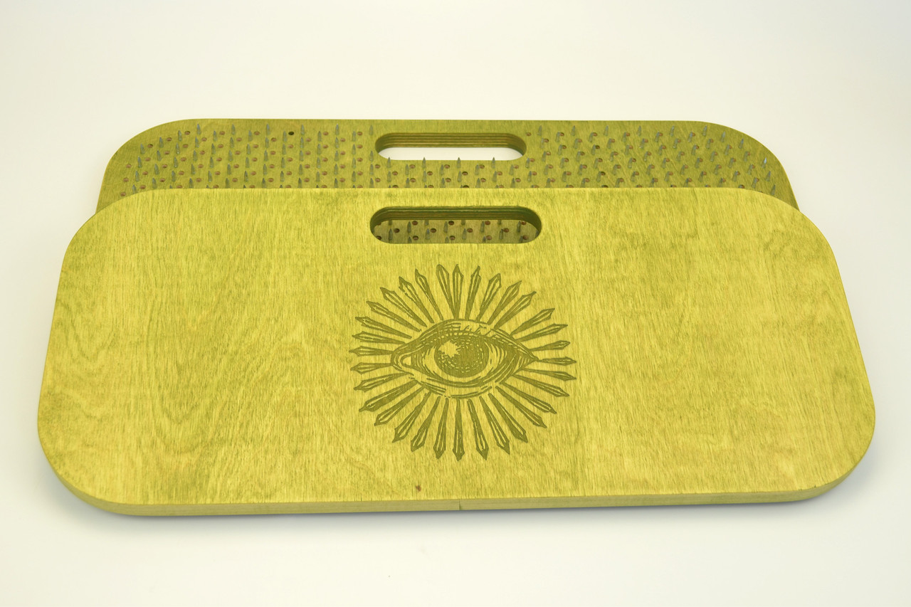 Наші майстри продумали кожну деталь у дошках для спини. Комлект складається з двох половинок , що вставляються одна в одну . Передбачена зручна ручка, щоб Ви легко змогли переносити дошки. При практиці слід розташовувати половинки по боках від хребта, щоб на нього не було тиску. Цвяхи у дошках розташовані за гексагоном, для рівномірного розподілу навантаження . Крок 15 мм - оптимальний для спини. Натуральне покриття олива -віск створює захисний шар від вологи та бруду, стійке до подряпин. Основа дошки фанера, що дозволяє зробити дошки легкими і міцними. Торцеві зрізи шпоновані натуральним кленом, це надає дошці довершеності.